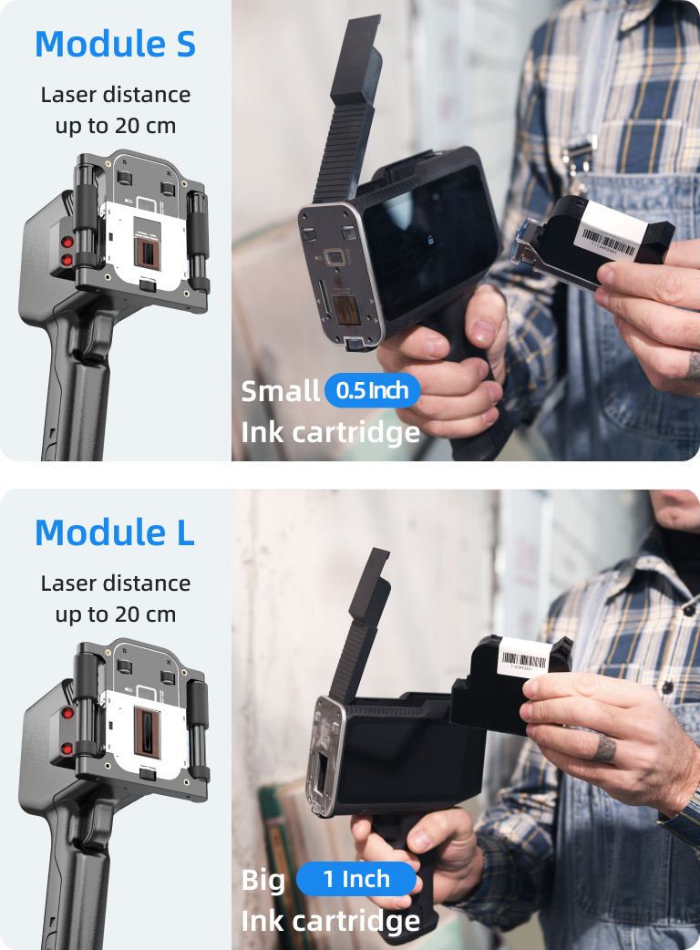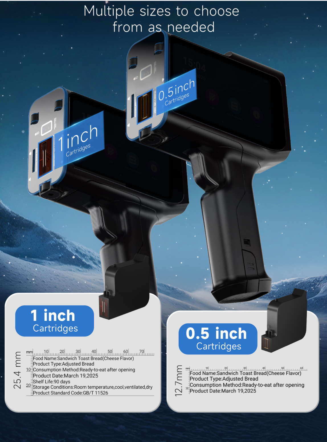 Professional compatible ink cartridges for Printisian handheld inkjet printers. Available in 0.5-inch and 1-inch heights, water-based and solvent-based inks, and multiple colors including special invisible inks.