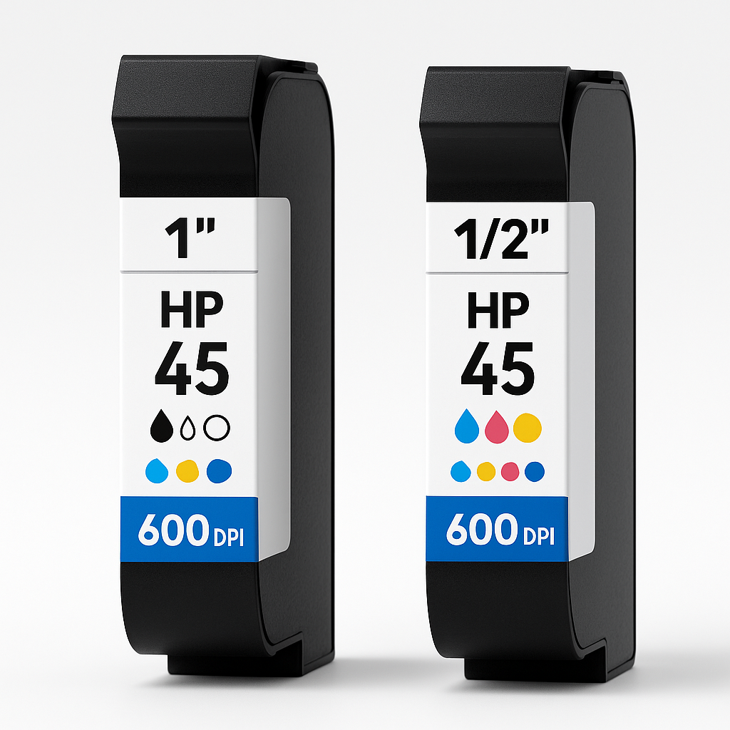 HP 45-compatible cartridges, 600 DPI precision, 1" or 1/2" size options, available in multiple colors for both water-based and solvent inks.
